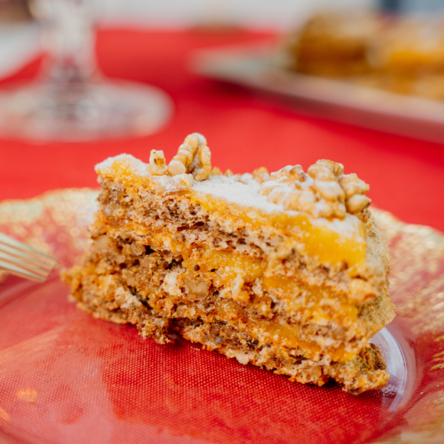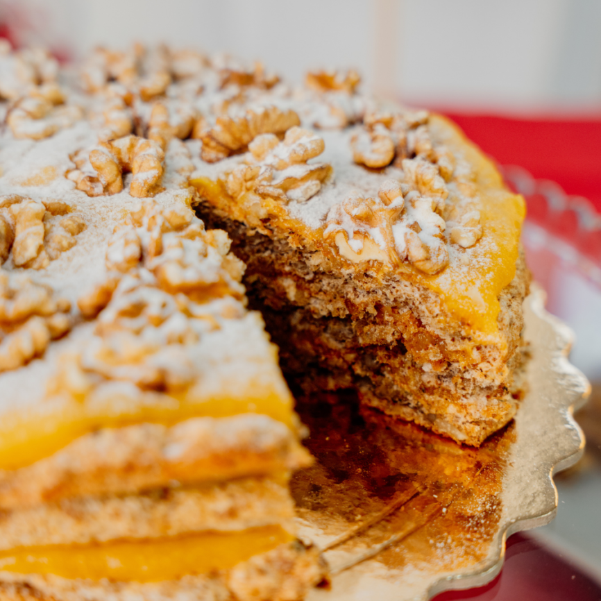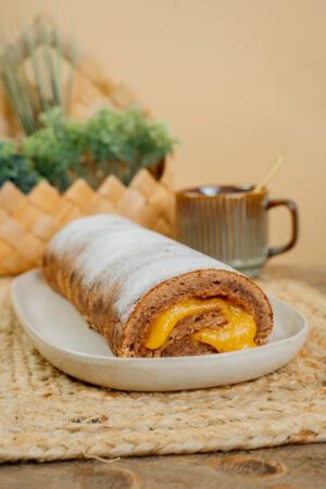 Uma torta húmida, com coco ralado por dentro e por fora. No interior, uma fina camada de doce de ovos traz cremosidade e um toque suave de doçura, tornando cada pedaço ainda mais especial.